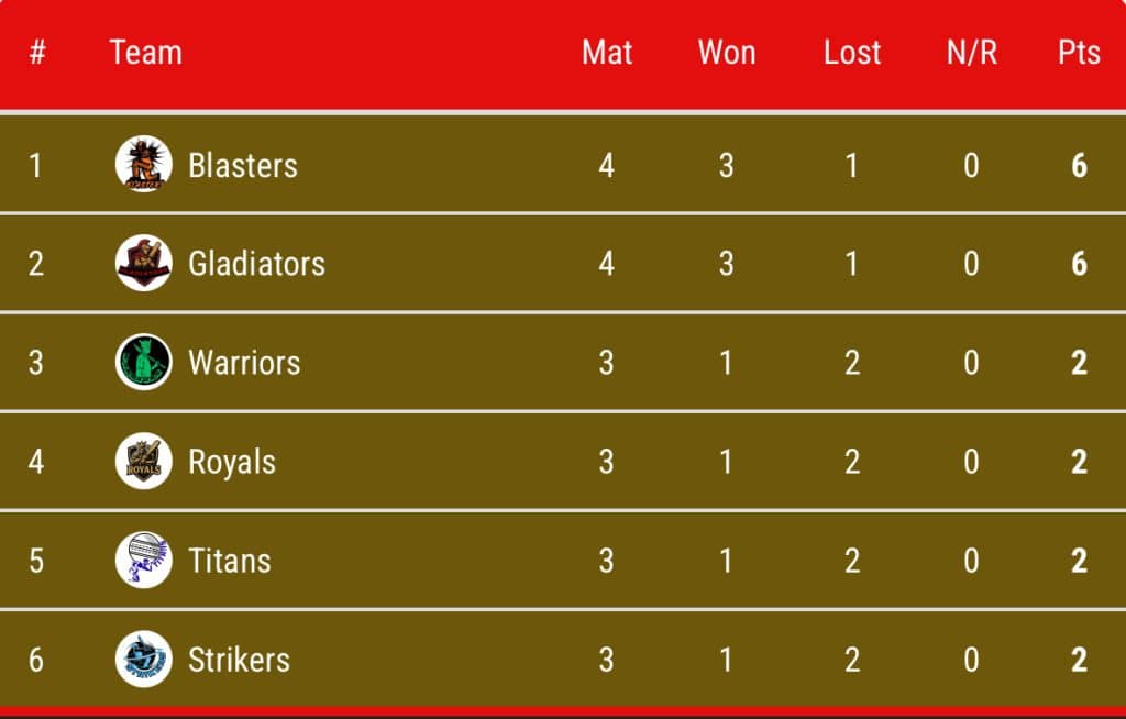 - Gladiators 110/8 in 20 Overs (Brian Asaba 33, Gerald Olipa 13; Yashashvi Joshi 2/20)