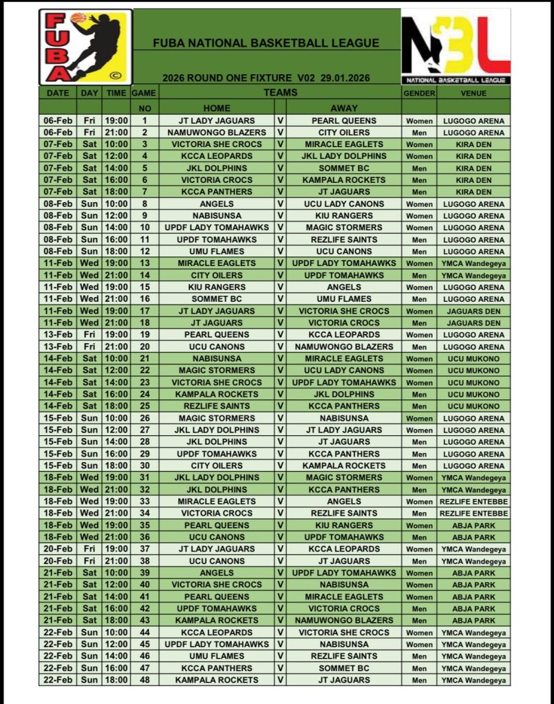 Uganda’s basketball fraternity has received an early lift after the Federation of Uganda Basketball Associations (FUBA) released the National Basketball League Round One fixtures for the 2026 season, setting up weeks of action across the country’s top arenas.