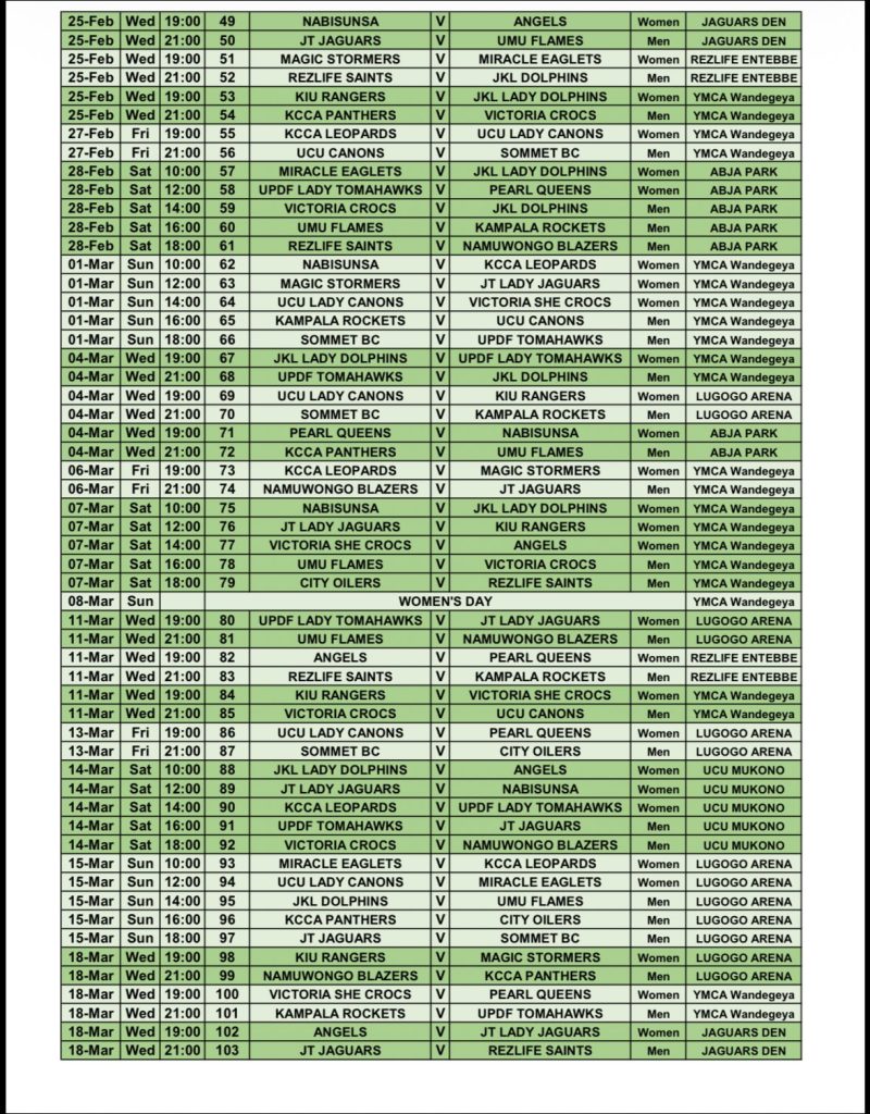 Midweek floodlit games at YMCA Wandegeya and Lugogo are also expected to attract strong crowds, underlining the steady rise of women’s basketball in Uganda.