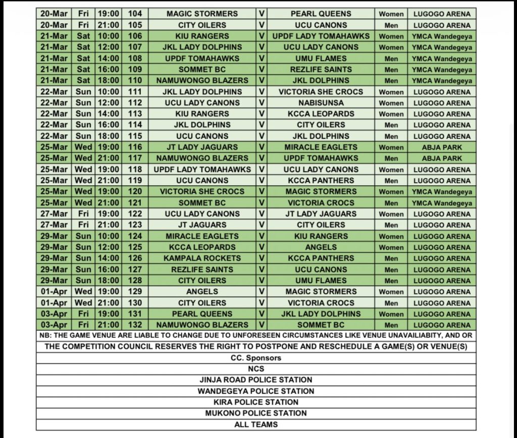 In the men’s division, familiar rivalries headline the opening weeks. City Oilers, Namuwongo Blazers, UCU Canons and Sommet BC face tight schedules that leave little room for slow starts.